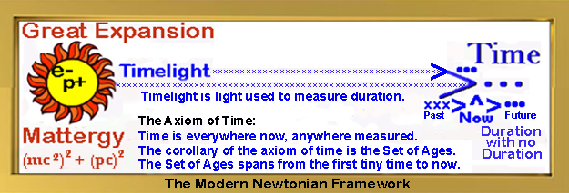 The Axiom of Time: Time is everywhere now, anywhere measured. Time is a DINO (Dimension in Name Only), and a DIMO (Dimension in Math Only). We live experience -- the experience of age from young to old, constrained and resolved by the Age of The Universe, the anchor of The Set of Ages.
